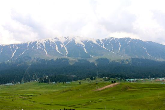 Gulmarg, known as Gulmarg in Kashmiri, is a town, hill station, popular tourist destination, popular skiing destination and a notified area committee in the Baramulla district in the Indian union territory of Jammu and Kashmir. It is located at a distance of 31 km from Baramulla and 49 km from Srinagar. Gulmarg became a part of the independent princely state of Kashmir and Jammu. Gulmarg lies in a cup-shaped valley in the Pir Panjal range of the Himalayas, at an altitude of 2,650 m (8,694 ft.), 56 km from Srinagar. The soil in Gulmarg comprises glacial deposits, lacustrine deposits and moraines of Pleistocene age covering shales, limestones, sandstones, schists and other varieties of rocks. The natural meadows of Gulmarg, which are covered with snow in winter, allow the growth of wild flowers such as daisies, forget-me-nots and buttercups during spring and summer. The meadows are interspersed by enclosed parks and small lakes, and surrounded by forests of green pine and fir. Skiing and other winter sports in Gulmarg are carried out on the slopes of Apharwat peak at a height of 4,267 m (13,999 ft.). Many points on Apharwat peak and Khilanmarg offer a panoramic view of Nanga parpat and Harmukh mountains.