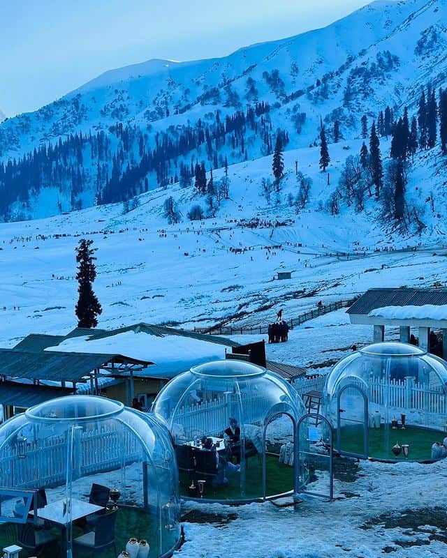 The Glass Igloo Cafe in Gulmarg is India’s First Glass Igloo Restaurant. Surrounded by snow-capped mountains and meadows of flowers, the cafe has become a unique tourist destination. the cafe manager borrowed the idea from Finland and constructed three new unseen igloos in the hotel’s courtyard. Enjoying a delicious dinner in the cafe while taking in the spectacular splendor of Gulmarg is a once-in-a-lifetime experience.