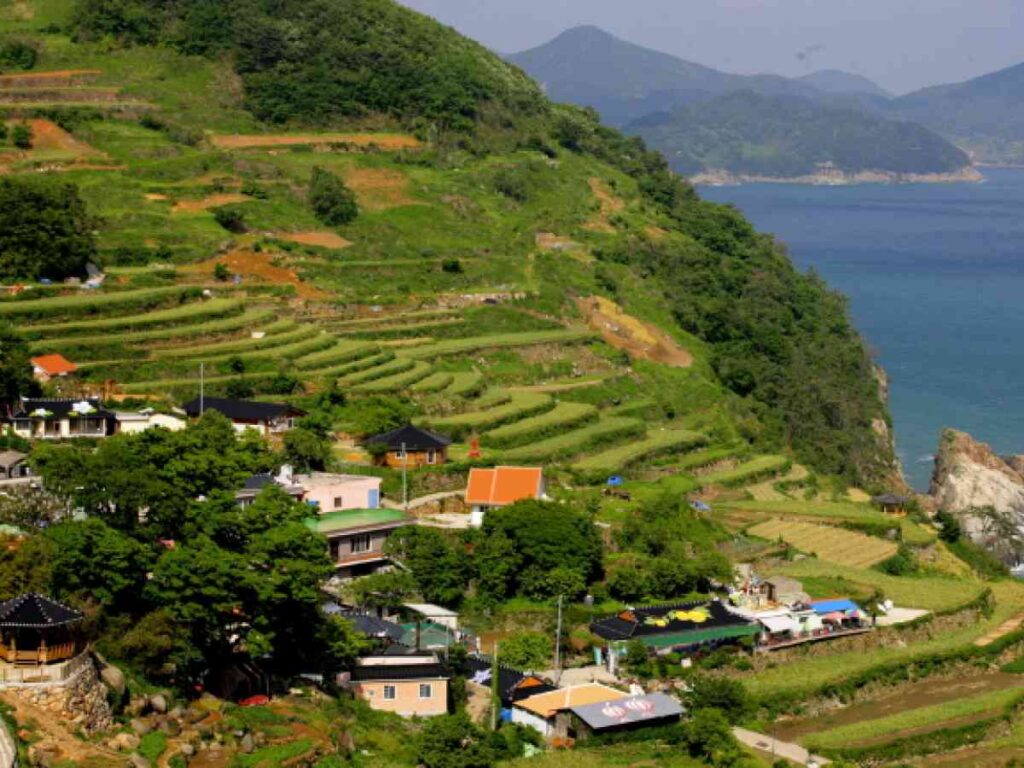 Darangee Village, a small well-preserved village in the southernmost area of west Namhae-gun, features an extraordinary sight of countless tiny fields (over 100 levels) on a steep mountain slope against the open sea.