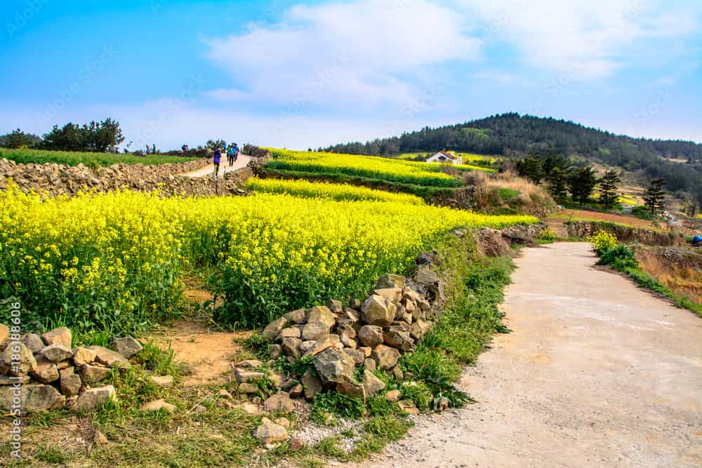 First-time visitors to Jeju Island need to plan their trip wisely, as the Jeju bucket list is long and varied. One of the musts on the list is Seopjikoji, a promontory on the coast famous for its serenity and romance. Yellow rape blossoms fill the field in the spring, creating a colorful contrast with the red soil and cerulean sky.