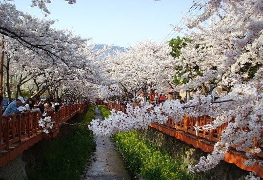 The fifth item on this list already touched on the festival of cherry blossoms in Jinhae, but the cherry blossom road at Yeojwa Stream is so strikingly beautiful that it deserves another mention (and another photo). Lovers visit this site to cross the Romance Bridge, which has been used as a shooting location for “Romance,” a drama starring Kim Ha-nul and Kim Jae-won. Bloggers say that these romantic blossoms can be most appreciated at night when there are fewer tourists and the pale pink flowers glow against the dark sky.